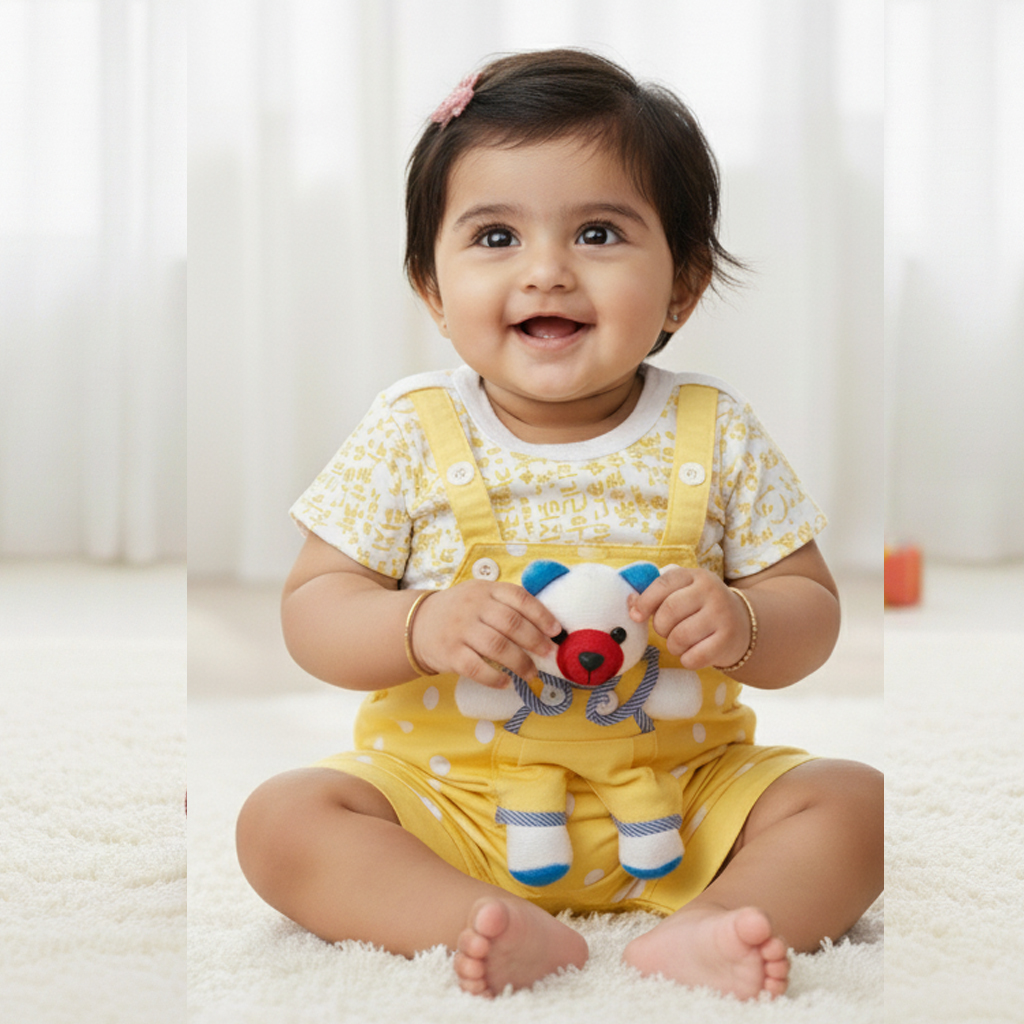 • 🌼 Yellow Dungaree with Teddy & White-Yellow Printed T-shirt