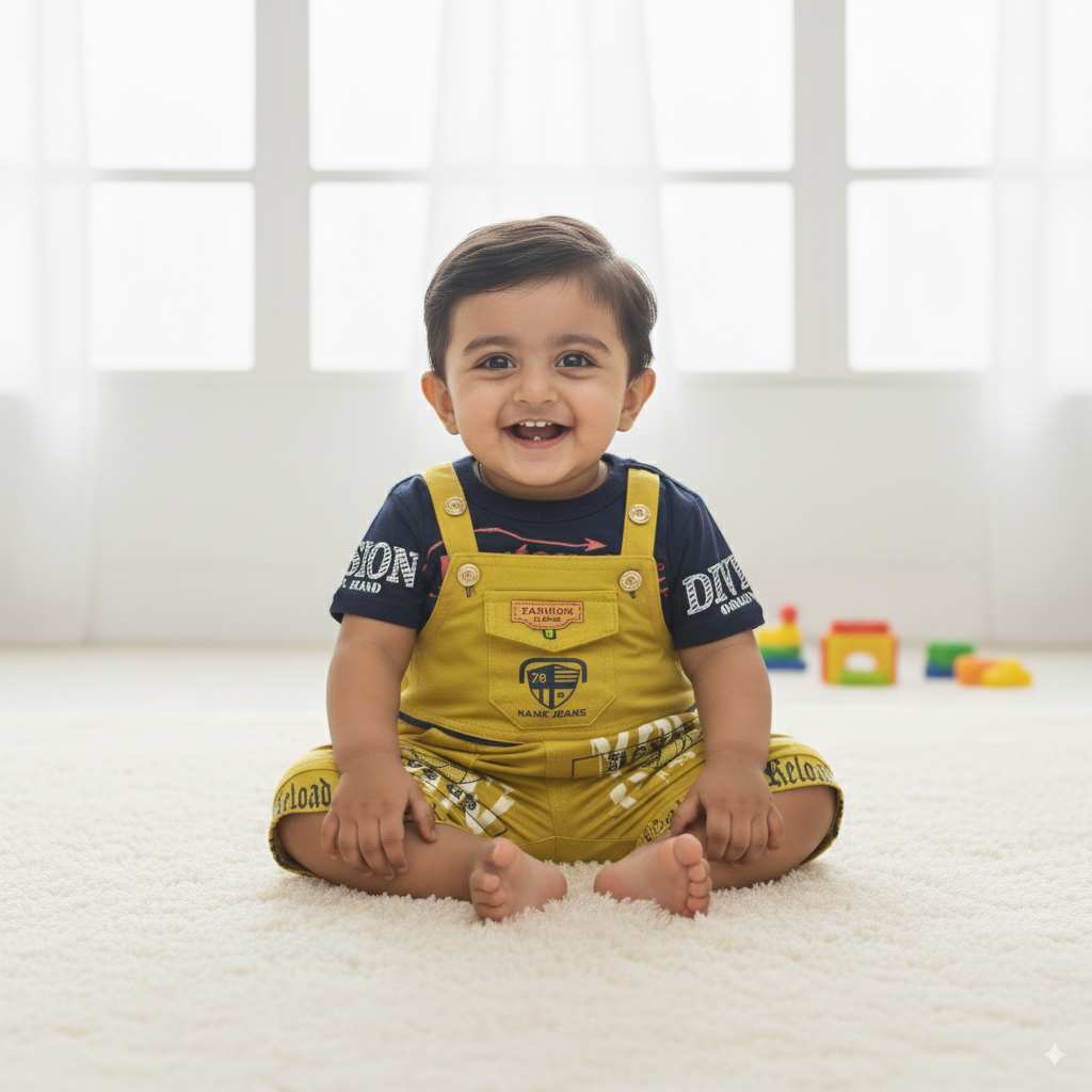 • 🌟 Yellow Dungaree with Navy Blue T-shirt